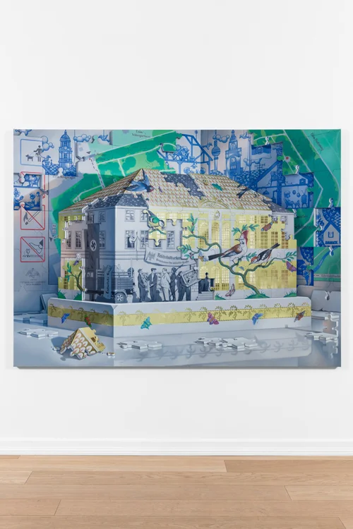 Chronicle is a series of oil paintings which uses layers of decorated jigsaw puzzles to create familiar or unexpected stories. Some of the paintings focus on houses and other inhabited structures. The decor on the jigsaw layers presents themes associated with the building and different periods of its history. The combination of these layers forms a new and richer perception of a seemingly well-known structure. It also leaves the viewer with some unanswered questions, such as: what is hidden behind the pieces which are still in place?